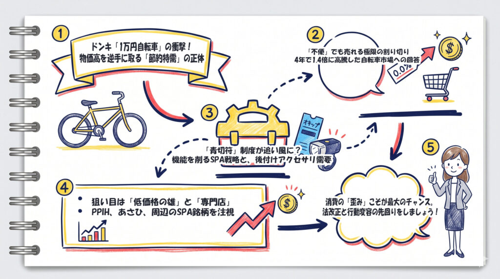 今、まさに市場ボードで小売り・消費関連セクターの値動きを睨みながら、この原稿を緊急で書き進めています。 過去に私が「安かろう悪かろう」という先入観だけで、デフレを味方につけた小売り株の大相場を取り逃がした苦い記憶が、いま再び蘇ってきています。あの時の相場の空気感と、今の「節約消費」への強烈なシフトは、驚くほど似ているのです。今回のドン・キホーテの「1万円自転車」のニュースは、単なるヒット商品という枠を超え、消費者の行動変容という地殻変動を鮮明に映し出しています。
