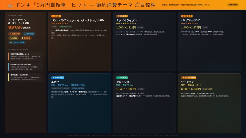 まず、この消費トレンドの中心にいるのがパン・パシフィック・インターナショナルHD(7532)です。2026年6月期の中間決算でも大幅な増収増益を叩き出しており、PB(プライベートブランド)の成功が利益率の改善に直結しています。今後、この「機能削減」のコンセプトが電動アシスト自転車や白物家電へ横展開されれば、株価にとっても中長期の力強いカタリスト(上昇要因)になるでしょう。